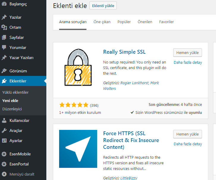 Eklentiler/Yeni ekle den Really Simple SSL eklentisini yükleyip etkinleştirdim.